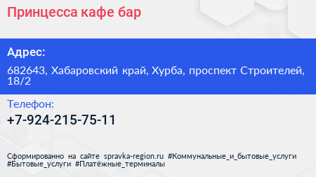 Принцесса, кафе-бар по адресу 682643, Хабаровский край, Хурба, проспект Строителей, 18/2 в дальнейшем Организация, размещена в следующих категориях: