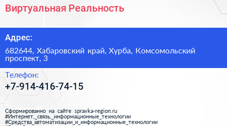 Виртуальная Реальность по адресу 682644, Хабаровский край, Хурба, Комсомольский проспект, 3 в дальнейшем Организация, размещена в следующих категориях: