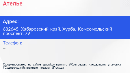 Ателье по адресу 682645, Хабаровский край, Хурба, Комсомольский проспект, 79 в дальнейшем Организация, размещена в следующих категориях: