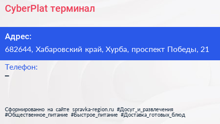 CyberPlat, терминал по адресу 682644, Хабаровский край, Хурба, проспект Победы, 21 в дальнейшем Организация, размещена в следующих категориях: