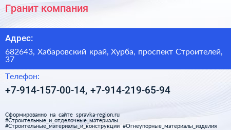 Гранит, компания по адресу 682643, Хабаровский край, Хурба, проспект Строителей, 37 в дальнейшем Организация, размещена в следующих категориях: