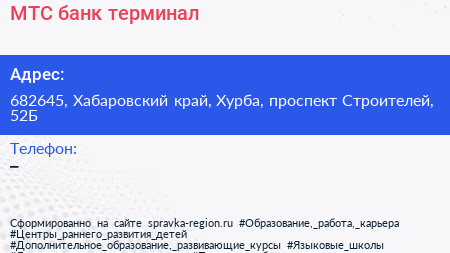 МТС банк, терминал по адресу 682645, Хабаровский край, Хурба, проспект Строителей, 52Б в дальнейшем Организация, размещена в следующих категориях: