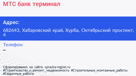 МТС банк, терминал по адресу 682643, Хабаровский край, Хурба, Октябрьский проспект, 4 в дальнейшем Организация, размещена в следующих категориях: