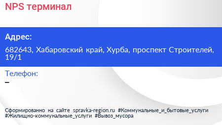 NPS, терминал по адресу 682643, Хабаровский край, Хурба, проспект Строителей, 19/1 в дальнейшем Организация, размещена в следующих категориях:
