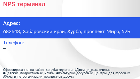 NPS, терминал по адресу 682643, Хабаровский край, Хурба, проспект Мира, 52Б в дальнейшем Организация, размещена в следующих категориях: