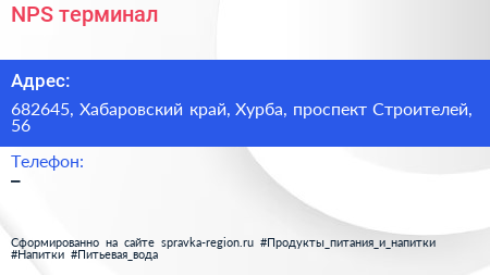 NPS, терминал по адресу 682645, Хабаровский край, Хурба, проспект Строителей, 56 в дальнейшем Организация, размещена в следующих категориях: