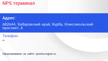 NPS, терминал по адресу 682644, Хабаровский край, Хурба, Комсомольский проспект, 6 в дальнейшем Организация, размещена в следующих категориях: