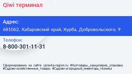 Qiwi, терминал по адресу 681062, Хабаровский край, Хурба, Добровольского, 9 в дальнейшем Организация, размещена в следующих категориях: