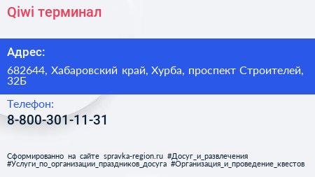 Qiwi, терминал по адресу 682644, Хабаровский край, Хурба, проспект Строителей, 32Б в дальнейшем Организация, размещена в следующих категориях: