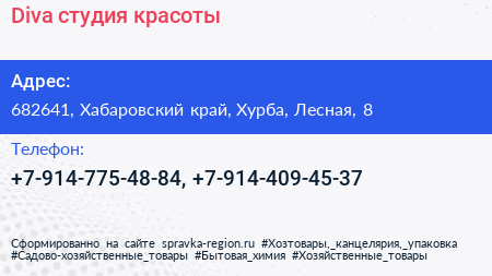 Diva, студия красоты по адресу 682641, Хабаровский край, Хурба, Лесная, 8 в дальнейшем Организация, размещена в следующих категориях: