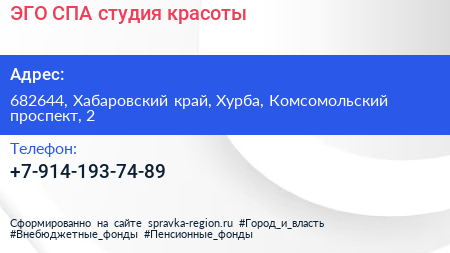 ЭГО-СПА, студия красоты по адресу 682644, Хабаровский край, Хурба, Комсомольский проспект, 2 в дальнейшем Организация, размещена в следующих категориях: