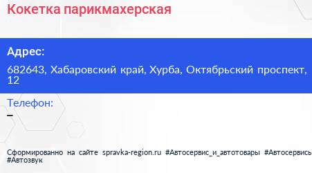 Кокетка, парикмахерская по адресу 682643, Хабаровский край, Хурба, Октябрьский проспект, 12 в дальнейшем Организация, размещена в следующих категориях: