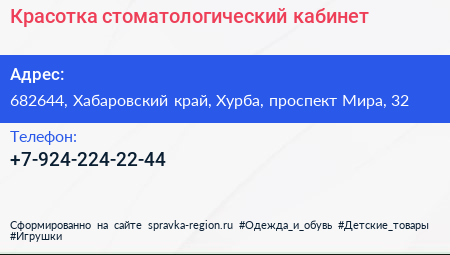 Красотка, стоматологический кабинет по адресу 682644, Хабаровский край, Хурба, проспект Мира, 32 в дальнейшем Организация, размещена в следующих категориях: