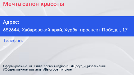 Мечта, салон красоты по адресу 682644, Хабаровский край, Хурба, проспект Победы, 17 в дальнейшем Организация, размещена в следующих категориях: