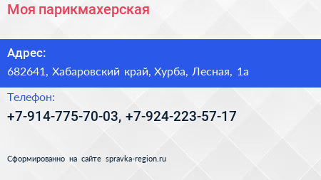 Моя парикмахерская по адресу 682641, Хабаровский край, Хурба, Лесная, 1а в дальнейшем Организация, размещена в следующих категориях:
