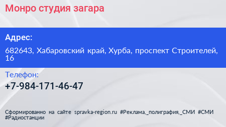 Монро, студия загара по адресу 682643, Хабаровский край, Хурба, проспект Строителей, 16 в дальнейшем Организация, размещена в следующих категориях:
