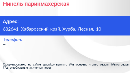 Нинель, парикмахерская по адресу 682641, Хабаровский край, Хурба, Лесная, 10 в дальнейшем Организация, размещена в следующих категориях: