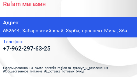 Rafam, магазин по адресу 682644, Хабаровский край, Хурба, проспект Мира, 36а в дальнейшем Организация, размещена в следующих категориях: