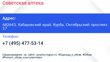Советская аптека по адресу 682643, Хабаровский край, Хурба, Октябрьский проспект, 17 в дальнейшем Организация, размещена в следующих категориях: