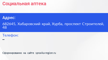 Социальная аптека по адресу 682645, Хабаровский край, Хурба, проспект Строителей, 48 в дальнейшем Организация, размещена в следующих категориях:
