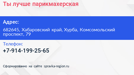 Ты лучше, парикмахерская по адресу 682645, Хабаровский край, Хурба, Комсомольский проспект, 79 в дальнейшем Организация, размещена в следующих категориях: