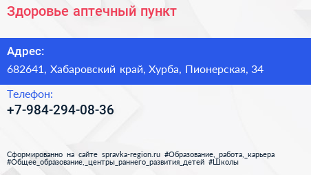 Здоровье, аптечный пункт по адресу 682641, Хабаровский край, Хурба, Пионерская, 34 в дальнейшем Организация, размещена в следующих категориях: