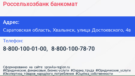 Россельхозбанк, банкомат по адресу Саратовская область, Хвалынск, улица Достоевского, 4в в дальнейшем Организация, размещена в следующих категориях: