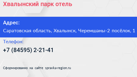 Хвалынский, парк-отель по адресу Саратовская область, Хвалынск, Черемшаны-2 посёлок, 1 в дальнейшем Организация, размещена в следующих категориях: