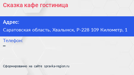 Сказка, кафе-гостиница по адресу Саратовская область, Хвалынск, Р-228 109 Километр, 1 в дальнейшем Организация, размещена в следующих категориях: