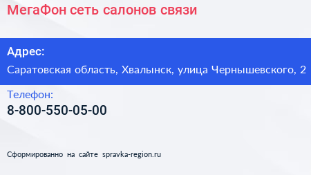 МегаФон, сеть салонов связи по адресу Саратовская область, Хвалынск, улица Чернышевского, 2 в дальнейшем Организация, размещена в следующих категориях: