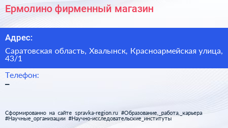Ермолино, фирменный магазин по адресу Саратовская область, Хвалынск, Красноармейская улица, 43/1 в дальнейшем Организация, размещена в следующих категориях:
