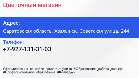 Цветочный магазин по адресу Саратовская область, Хвалынск, Советская улица, 244 в дальнейшем Организация, размещена в следующих категориях: