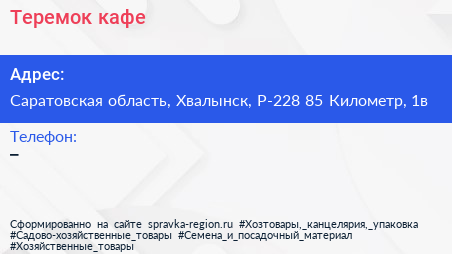 Теремок, кафе по адресу Саратовская область, Хвалынск, Р-228 85 Километр, 1в в дальнейшем Организация, размещена в следующих категориях: