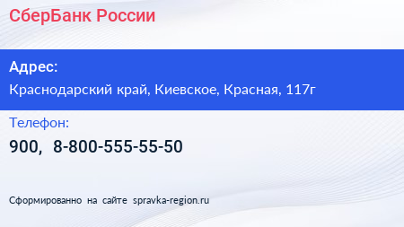 СберБанк России по адресу Краснодарский край, Киевское, Красная, 117г в дальнейшем Организация, размещена в следующих категориях:
