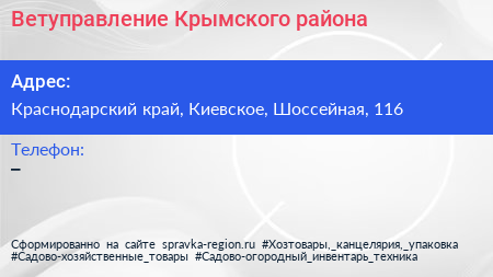 Ветуправление Крымского района по адресу Краснодарский край, Киевское, Шоссейная, 116 в дальнейшем Организация, размещена в следующих категориях: