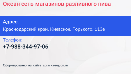 Океан, сеть магазинов разливного пива по адресу Краснодарский край, Киевское, Горького, 113е в дальнейшем Организация, размещена в следующих категориях: