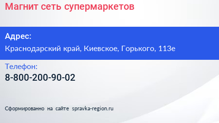 Магнит, сеть супермаркетов по адресу Краснодарский край, Киевское, Горького, 113е в дальнейшем Организация, размещена в следующих категориях: