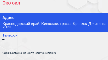 Эко оил по адресу Краснодарский край, Киевское, трасса Крымск-Джигинка, 20км в дальнейшем Организация, размещена в следующих категориях: