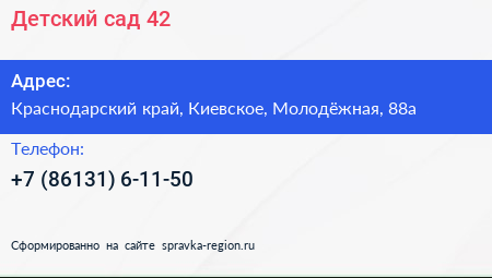 Детский сад №42 по адресу Краснодарский край, Киевское, Молодёжная, 88а в дальнейшем Организация, размещена в следующих категориях: