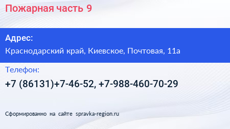 Пожарная часть №9 по адресу Краснодарский край, Киевское, Почтовая, 11а в дальнейшем Организация, размещена в следующих категориях:
