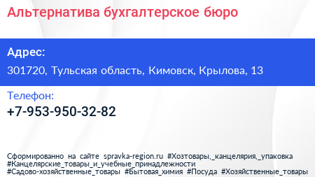 Альтернатива, бухгалтерское бюро по адресу 301720, Тульская область, Кимовск, Крылова, 13 в дальнейшем Организация, размещена в следующих категориях: