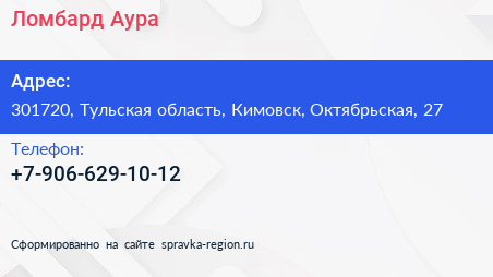 Ломбард-Аура по адресу 301720, Тульская область, Кимовск, Октябрьская, 27 в дальнейшем Организация, размещена в следующих категориях: