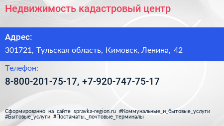 Недвижимость, кадастровый центр по адресу 301721, Тульская область, Кимовск, Ленина, 42 в дальнейшем Организация, размещена в следующих категориях: