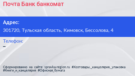 Почта Банк, банкомат по адресу 301720, Тульская область, Кимовск, Бессолова, 4 в дальнейшем Организация, размещена в следующих категориях: