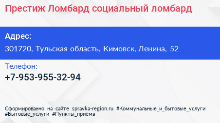 Престиж Ломбард, социальный ломбард по адресу 301720, Тульская область, Кимовск, Ленина, 52 в дальнейшем Организация, размещена в следующих категориях: