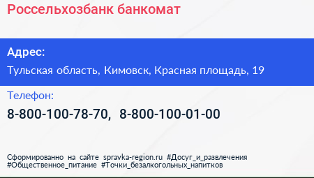 Россельхозбанк, банкомат по адресу Тульская область, Кимовск, Красная площадь, 19 в дальнейшем Организация, размещена в следующих категориях: