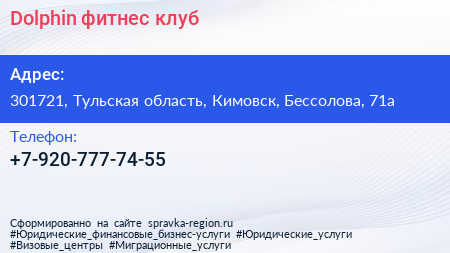 Dolphin, фитнес-клуб по адресу 301721, Тульская область, Кимовск, Бессолова, 71а в дальнейшем Организация, размещена в следующих категориях: