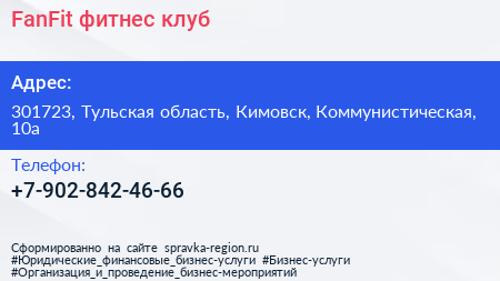 FanFit, фитнес-клуб по адресу 301723, Тульская область, Кимовск, Коммунистическая, 10а в дальнейшем Организация, размещена в следующих категориях: