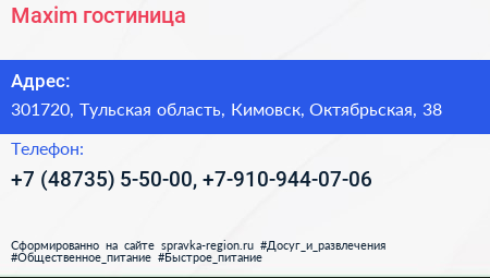 Maxim, гостиница по адресу 301720, Тульская область, Кимовск, Октябрьская, 38 в дальнейшем Организация, размещена в следующих категориях: