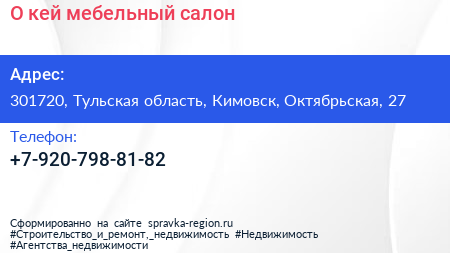 О`кей, мебельный салон по адресу 301720, Тульская область, Кимовск, Октябрьская, 27 в дальнейшем Организация, размещена в следующих категориях: